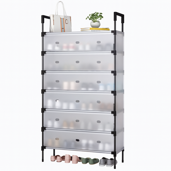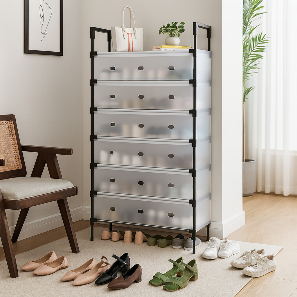 Su estructura apilable, resistente y transparente permite ver tus zapatos al instante, sin desorden visual ni acumulación de polvo