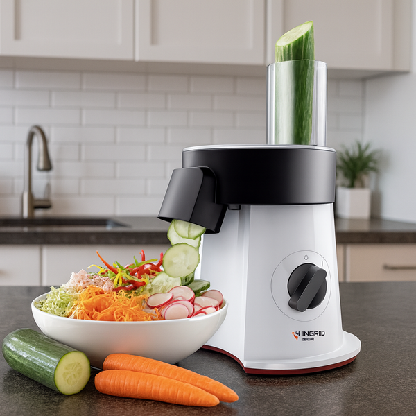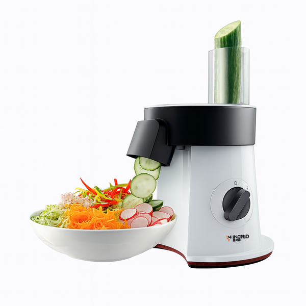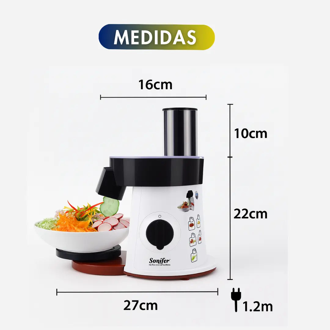Con el Rebanador Eléctrico Multifuncional, prepara tus comidas en segundos. Corta, ralla y rebana sin esfuerzo, sin desorden y sin peligro.